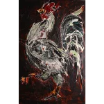 Een haan, brutaal en vrij geschilderd, geboren uit de dagelijkse confrontatie met buurmans kippenhok.